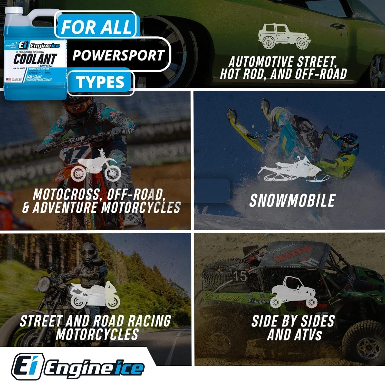 ✅ PHOSPHATE FREE, RTU - Engine Ice Hi-Performance coolant is phosphate free and ready to use, reducing operating temperatures and effectively keeping boil over temperatures to 256 Fahrenheit or less and freeze-up protection to -7 Fahrenheit✅ MAXIMIZE PERFORMANCE - With an average reduction in operating temperatures of 10 Fahrenheit - 20 Fahrenheit Engine Ice is perfect for the high-performance demands of your powersports vehicle.✅ EASY TO USE - Engine Ice Hi-Performance Motorcycle Coolant + Antifreeze provides superior head dispersion allowing you to maximize horsepower and performance. Easy to Use – Premixed with deionized water for out-of-the-bottle use.✅ STOP LOSING PERFORMANCE - Engineered to keep your operating temperatures at optimum performance to not lose power through excess heat; Engine Ice is safe for vehicles over all types of terrain and offers superior heat reduction vs. competitive products as shown in independent lab testing.✅ ADVANCED FORMULATION WITH OAT TECHNOLOGY - Product contains no ethylene glycol, uses propylene glycol to reduce operating temperatures more than other coolantsShare